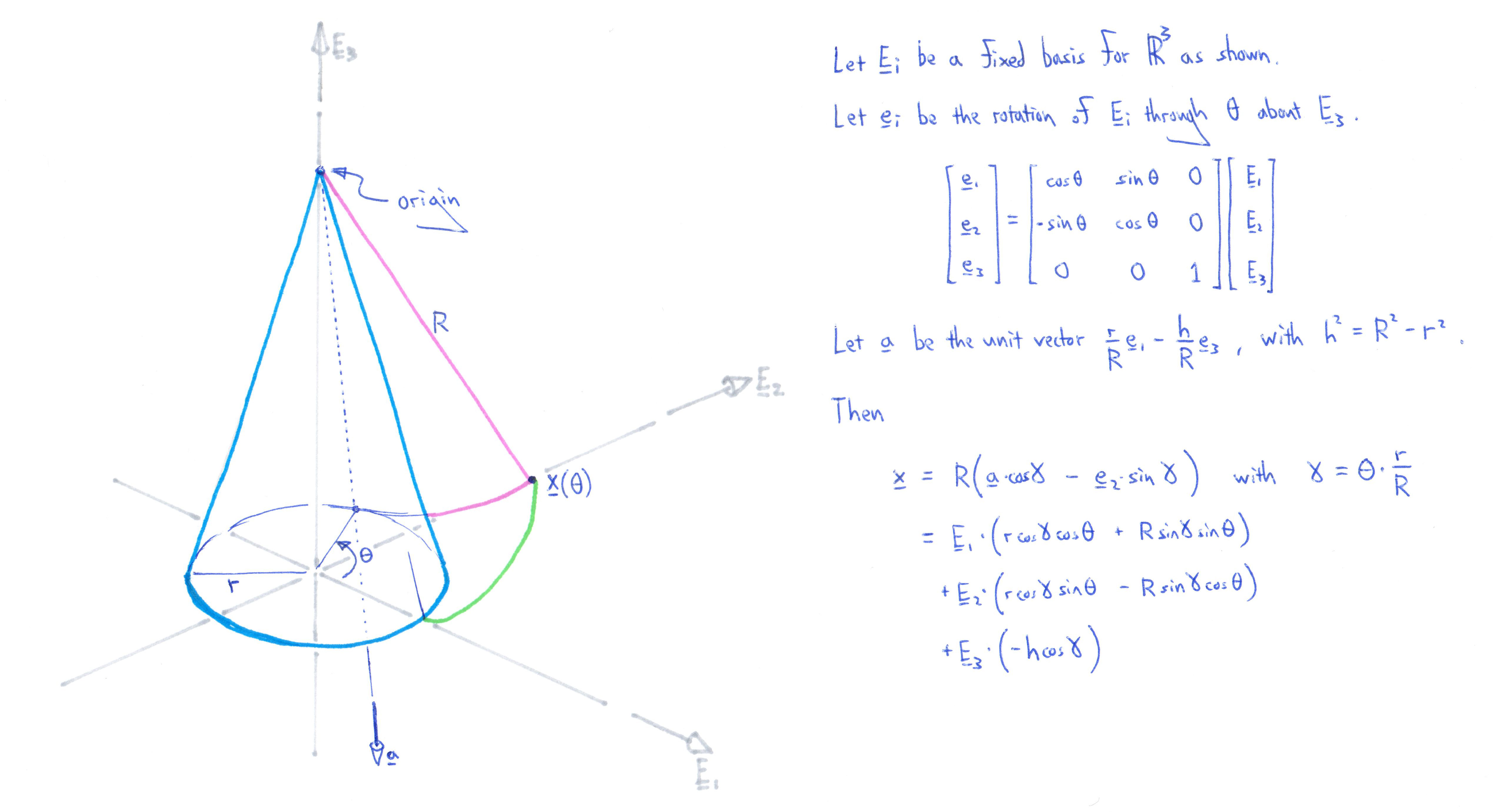 Previously we considered a point on the string connecting two disks. Here, we consider a line on the sheet of paper connecting the two cones. This line carves out a (ruled) surface as the paper unwraps from the cone. Here's my work for the path traced out by the tip of this line.