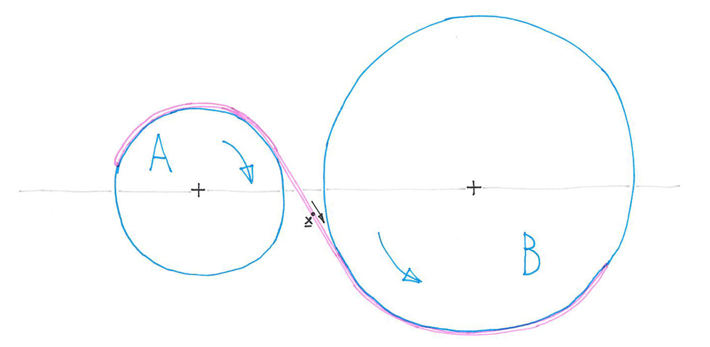 Imagine B pulling A in a steady motion. We build gear teeth that cause A and B to engage as if they were connected in this way.