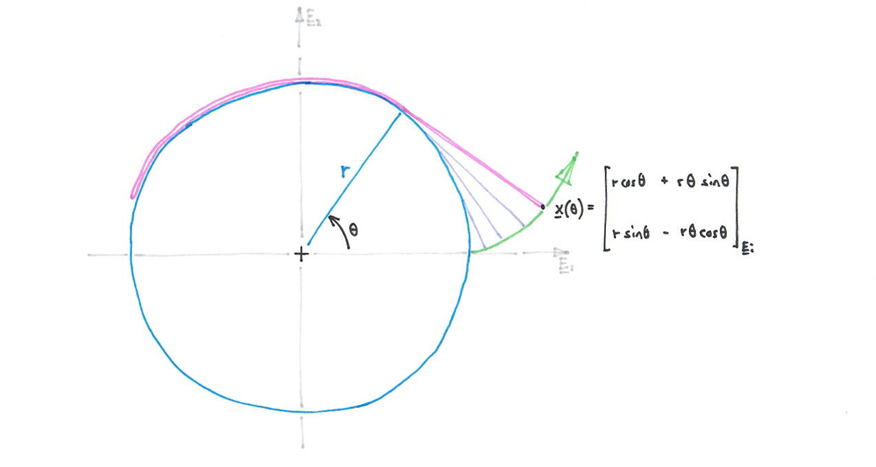 As A and B rotate, we see the point x moving along the line of the string. At the same time, from the perspective of the (rotating) disk A, the string is unwrapping from disk A, and the point x is tracing out a special curve known as an involute, shown below in green. This curve is the working surface of the gear tooth.