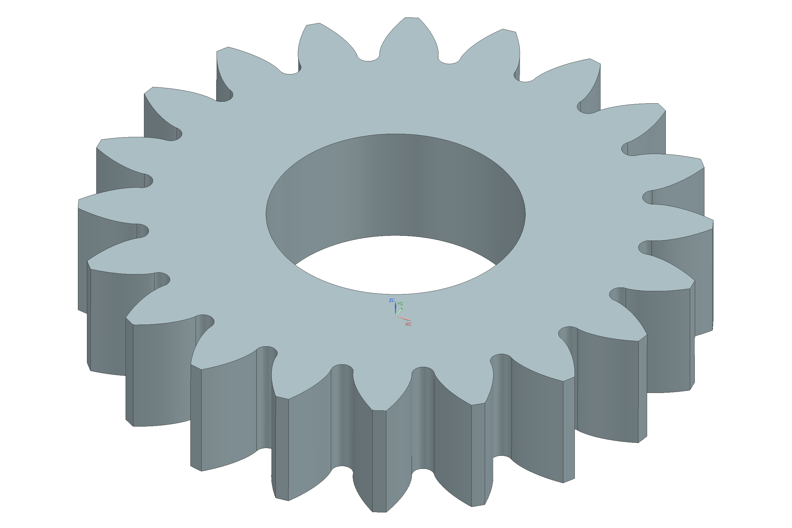 We use the law curve to split a solid body (with the split body tool), giving us the working face of one tooth. We then use reflection and rotation to create the full gear.