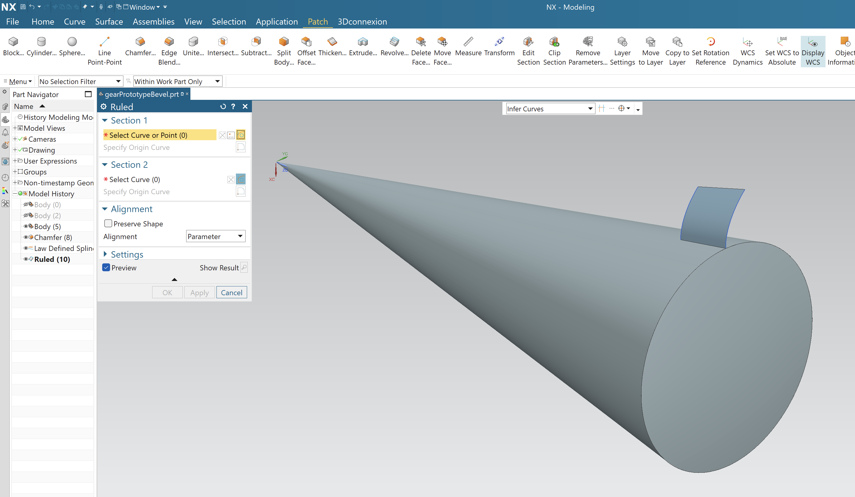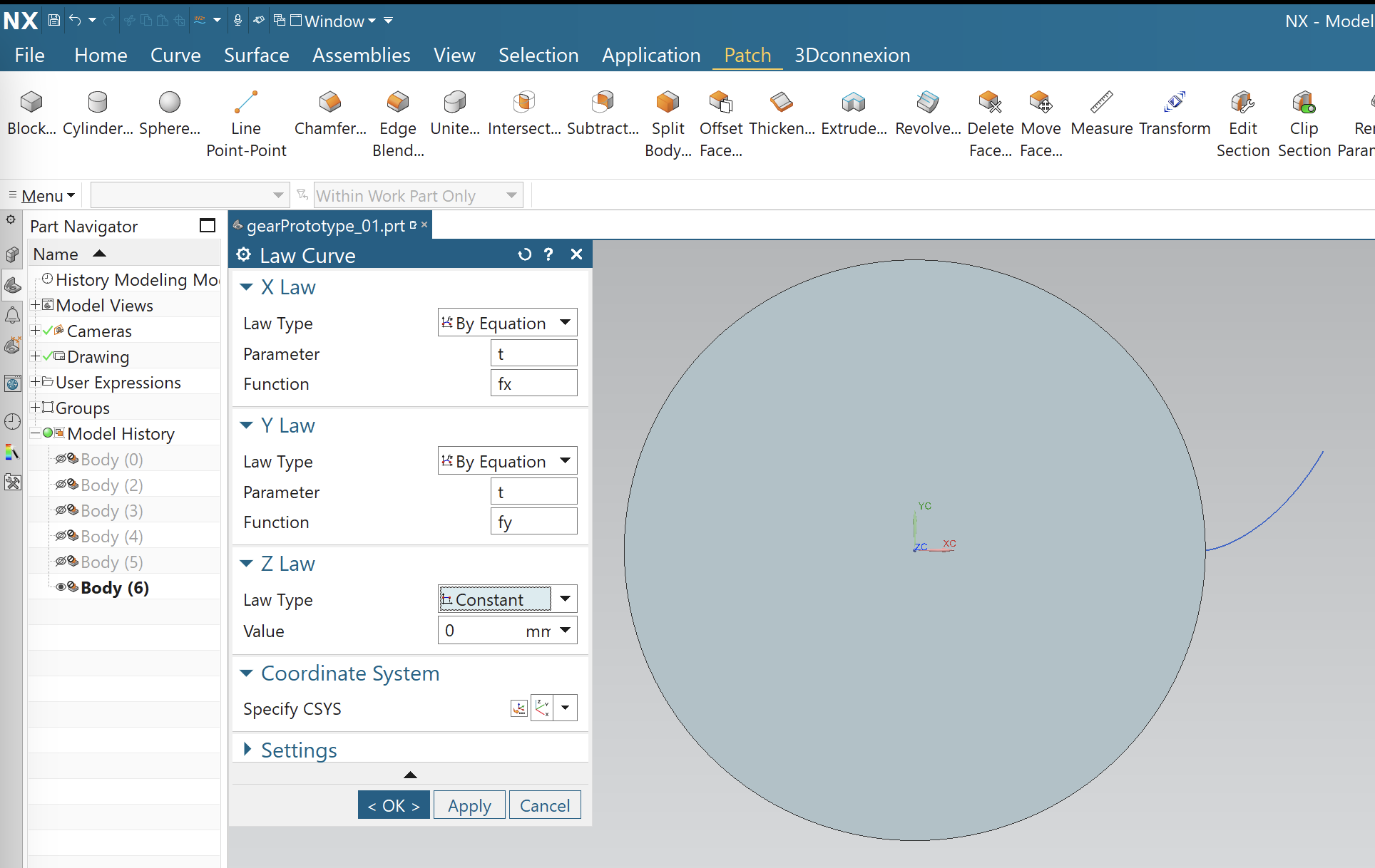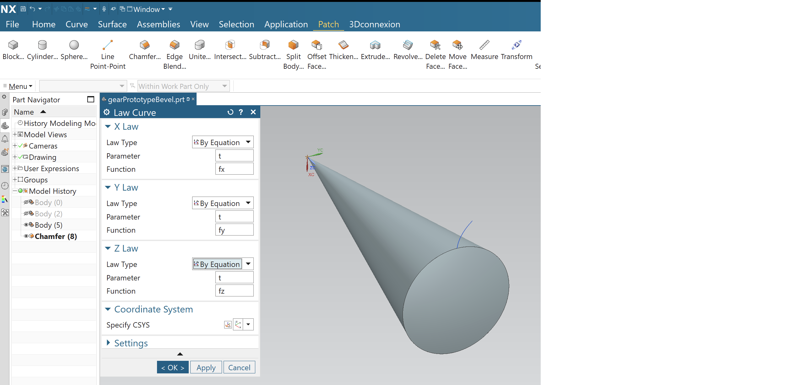 As before, we construct a so called law curve in NX. Here I've also constructed the appropriate base cone.