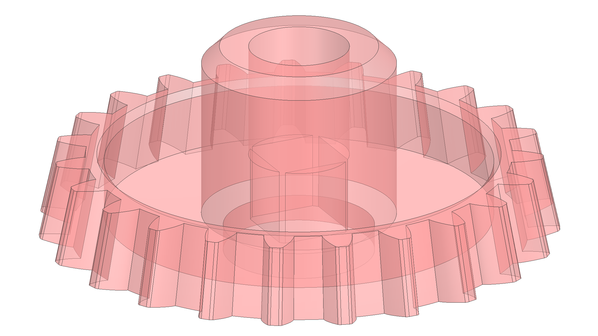 We use this ruled surface to split a solid body, creating the working surface of a bevel gear tooth. We then use reflections and rotations to create the full bevel gear.